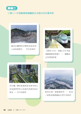 附錄二 二零二一年規劃署委聘顧問公司進行的主要研究 藍地石礦場及其鄰近地區初步 土地用途研究 — 可行性研究 《香港 2030+:跨越 2030 年的 規劃遠景與策略》 — 運輸與 土地用途評估 洪水橋/厦村新發展區未來市中心 及地區商業中心的城市及綠色設計 研究 ─ 可行性研究 新界北第一期發展研究 — 新田 /落馬洲發展樞紐之可行性研究 99 規劃署 │ 年報 2021-2022