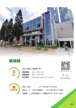 展城館 香港中環愛丁堡廣場 3 號 www.citygallery.gov.hk 熱線電話 (852) 3102 1242 地址 傳真號碼 (852) 3104 0129 電子郵件 enquiry@citygallery.gov.hk @hkcitygallery 星期一至四 上午十時正至下午六時正 開放時間 星期五、六、日及公眾假期 上午十時正至下午七時正 逢星期二(公眾假期除外)及農曆新年初一及初二休館 108 108