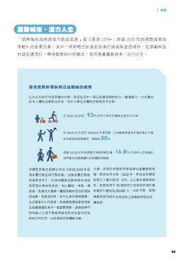 │ 專題 躍動城市,活力人生 「提升集約高密度城市的宜居度」是《香港 2030+:跨越 2030 年的規劃遠景與 策略》的首要元素。其中一項策略方針是把香港打造成為宜居城市,在規劃和設 計建設環境時,秉持動態設計的概念,從而推廣躍動城市,活力人生。 48