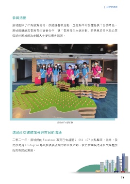 │ 我們的表現 參與活動 展城館除了作為展覽場地,亦通過各項活動,加強為不同群體提供平台的角色。 展城館繼續與香港青年協會合作,讓「香港青年大使計劃」的學員於周末及公眾 假期於展城館為參觀人士提供導賞服務。 香港青年大使計劃 透過社交媒體加強與市民的溝通 二零二一年,展城館的 Facebook 專頁已有超過 2 962 407 次點擊率。此外,我 們亦透過 Instagram 專頁推廣展城館的節目及活動。我們會繼續透過社交媒體加 強與市民的溝通。 78