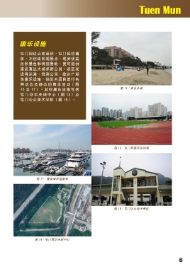 康樂設施 屯門周邊山巒起伏,屯門徑的鋪 築,不但連繫觀景點,觀賞優美 自然景色和特別景緻,更可提供 通道直達大欖郊野公園。該區現 設有泳灘、海濱公園、散步廣場 等康樂設施,供區內居民進行各 種動態及靜態的康樂活動(圖 15 至 17)。 其 他 康 樂 設 施 包 括 圖 15:黃金泳灘 屯門哥爾夫球中心(圖 18)及 屯門公眾騎術學校(圖 19)。 圖 16:屯門鄧肇堅運動場 圖 17:黃金海岸遊艇會 圖 19:屯門公眾騎術學校 圖 18:屯門哥爾夫球中心 8