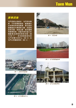 康樂設施 屯門周邊山巒起伏,屯門徑的鋪 築,不但連繫觀景點,觀賞優美 自然景色和特別景緻,更可提供 通道直達大欖郊野公園。該區現 設有泳灘、海濱公園、散步廣場 等康樂設施,供區內居民進行各 種動態及靜態的康樂活動(圖 15 至 17)。 其 他 康 樂 設 施 包 括 圖 15:黃金泳灘 屯門哥爾夫球中心(圖 18)及 屯門公眾騎術學校(圖 19)。 圖 16:屯門鄧肇堅運動場 圖 17:黃金海岸遊艇會 圖 19:屯門公眾騎術學校 圖 18:屯門哥爾夫球中心 8